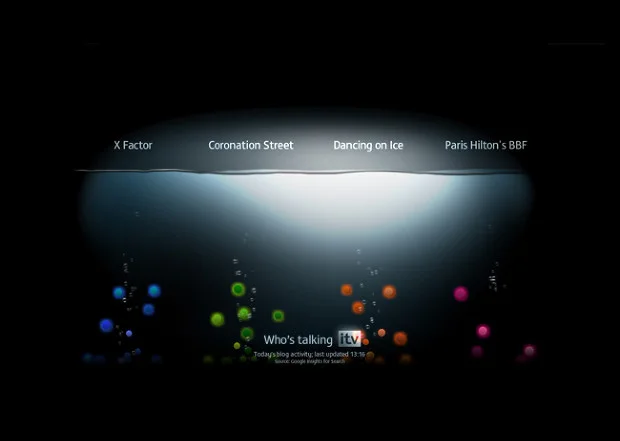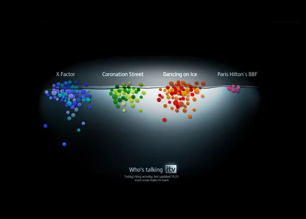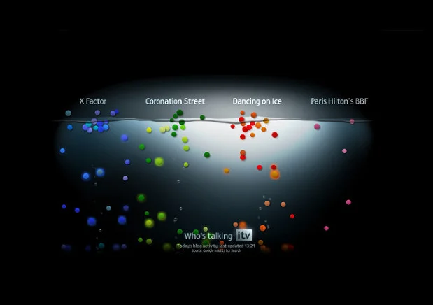 The ITV Talk Tank is a visual display of live chatter about ITV programmes. Each bubble represents a person blogging about a particular programme.